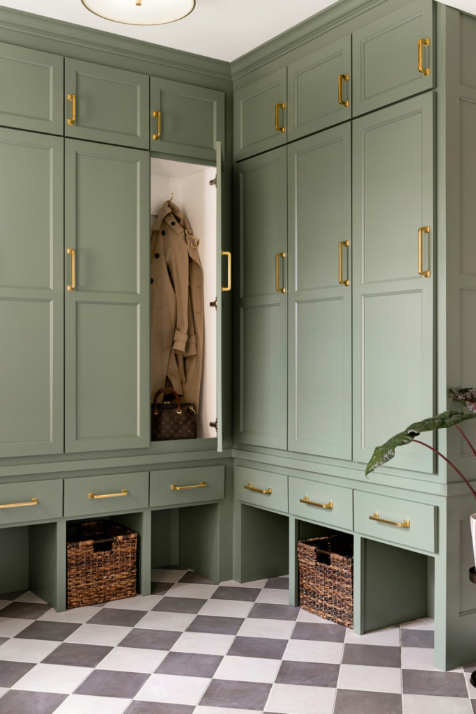 Mess disappears quickly when storage reaches the ceiling. Tall cabinets work best in dedicated mudrooms.