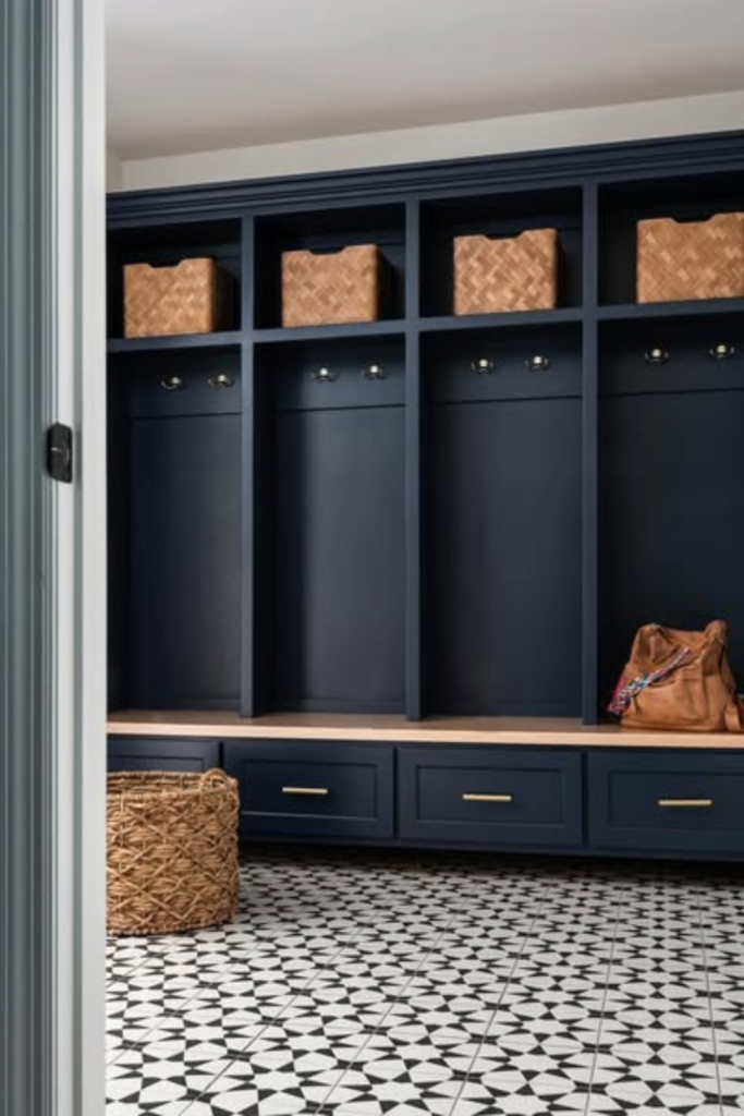 Dark, enclosed mudrooms shine with this layout because hidden storage keeps visual noise to a minimum.