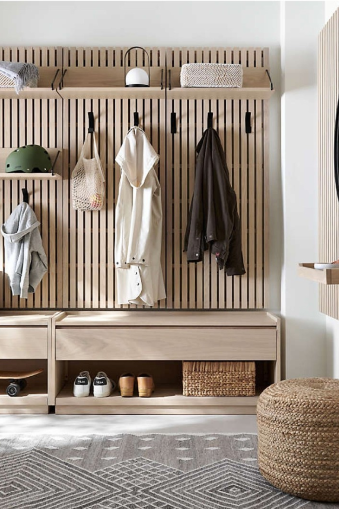 Bench below handles shoes and everyday bags. Recreate it with wood slat panels, a floating bench, and adjustable hooks.