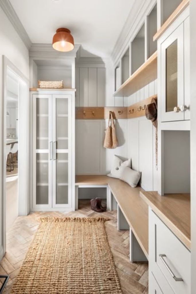 Long, narrow mudrooms feel lighter when upper cabinets don’t fully close off the space. Glass-front doors keep stored items visible.