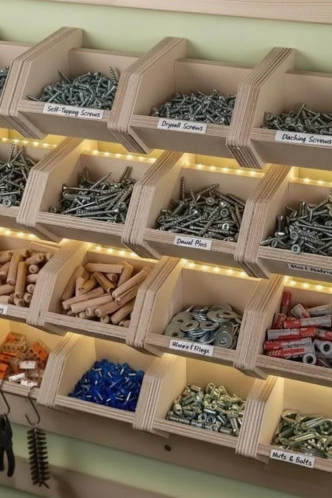 Build angled wooden bins so screws slide forward naturally. Label each pocket clearly and leave space to grab with one hand.