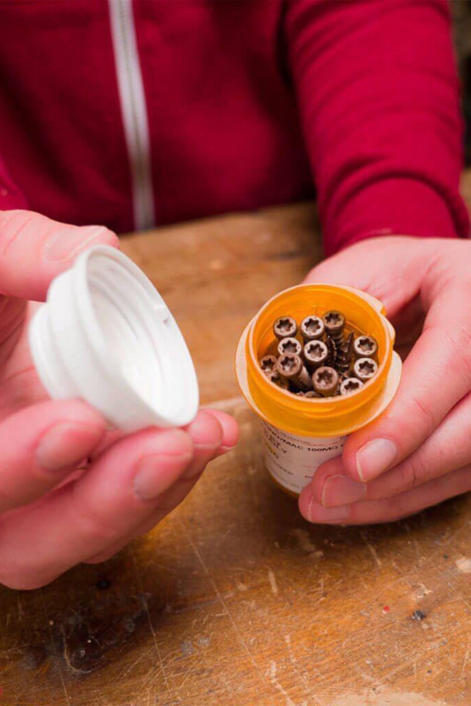 Small screw sets disappear fast unless they stay sealed and portable. Clean empty pill bottles, drop in one screw size per bottle, label the lid clearly.