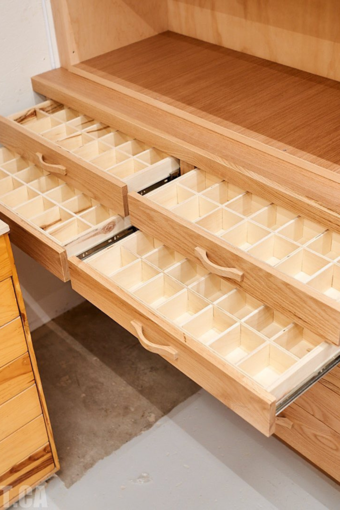 Turning a wide drawer into a hardware station works best in home workshops. Drop modular bins into a full-extension drawer.