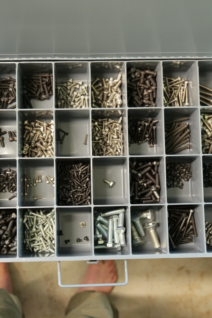 Knowing exactly where every screw lives removes hesitation completely. Use small drawer units with bold, readable labels.