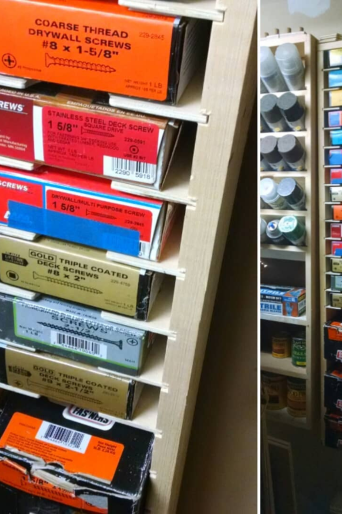 Factory boxes already tell you size, type, and count. Build slim shelves just deep enough for screw boxes to slide in and out.