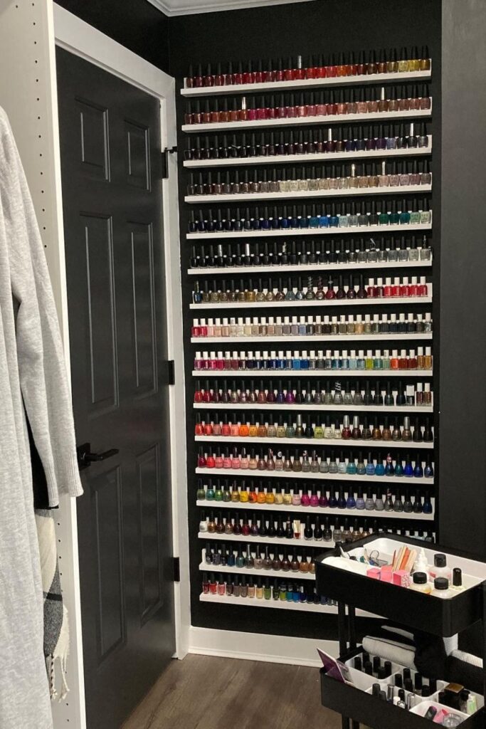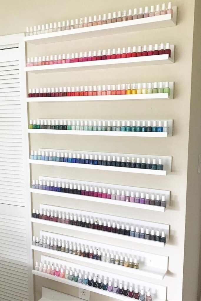 Colorful nail polish collections look far more organized once each shade has its own visible spot on clear wall shelves.
