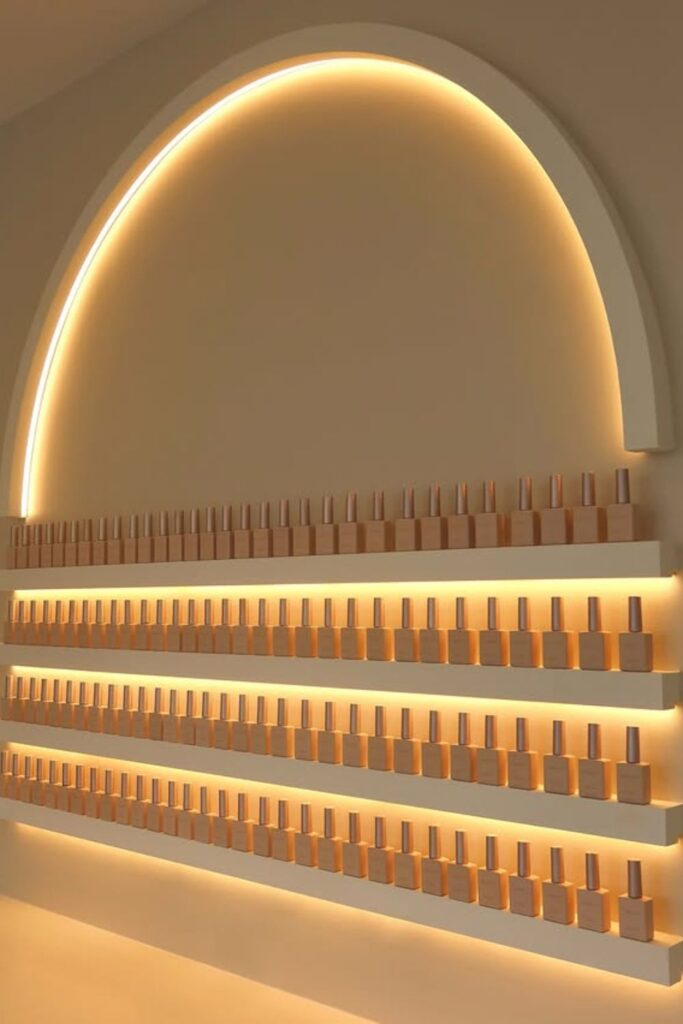 Soft lighting can completely transform a simple nail polish shelf into a standout display. Hidden LED strips placed under each floating shelf create a warm glow.