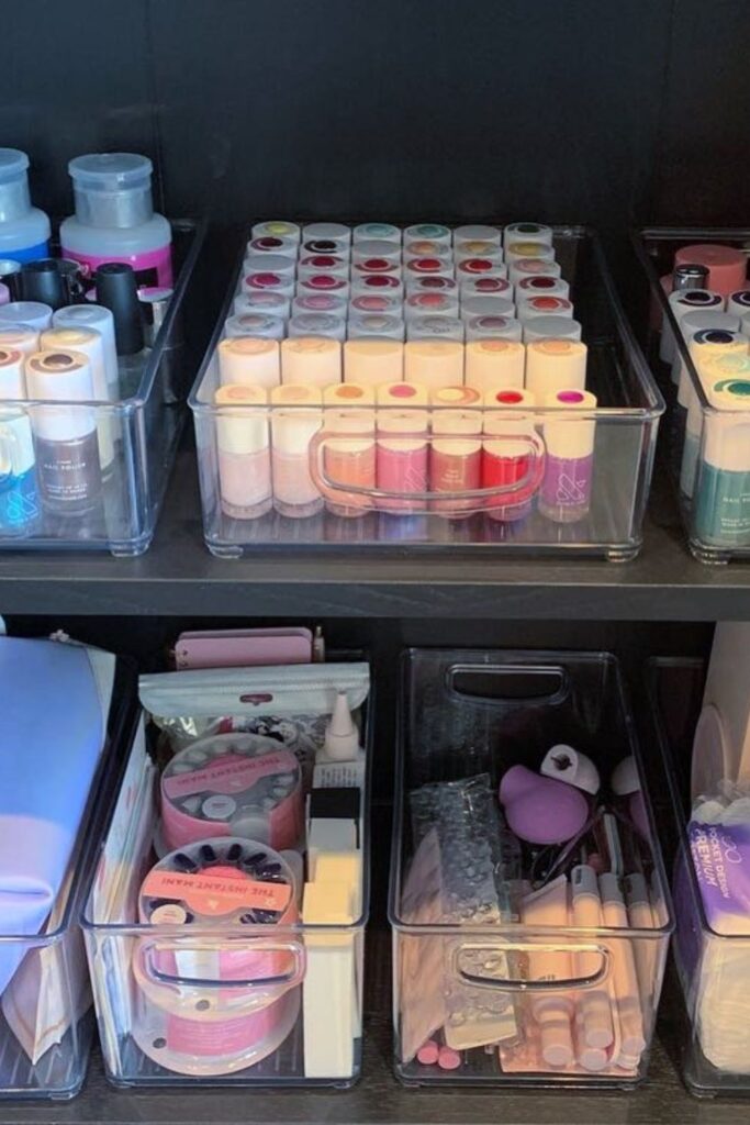 Deep cabinet shelves become much easier to manage when nail products are grouped inside clear storage bins.
