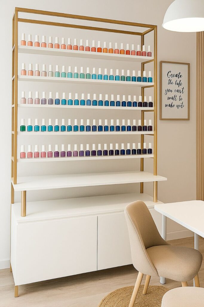 Choose storage that lets you see your polishes, like wall racks, tiered shelves, or clear organizers, after you’ve arranged everything.