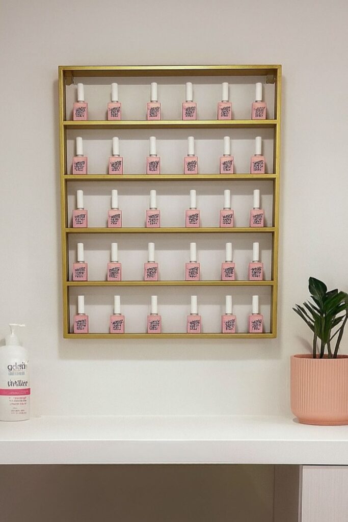 Minimal wall frames can double as compact nail polish displays while keeping a manicure area clean and organized.