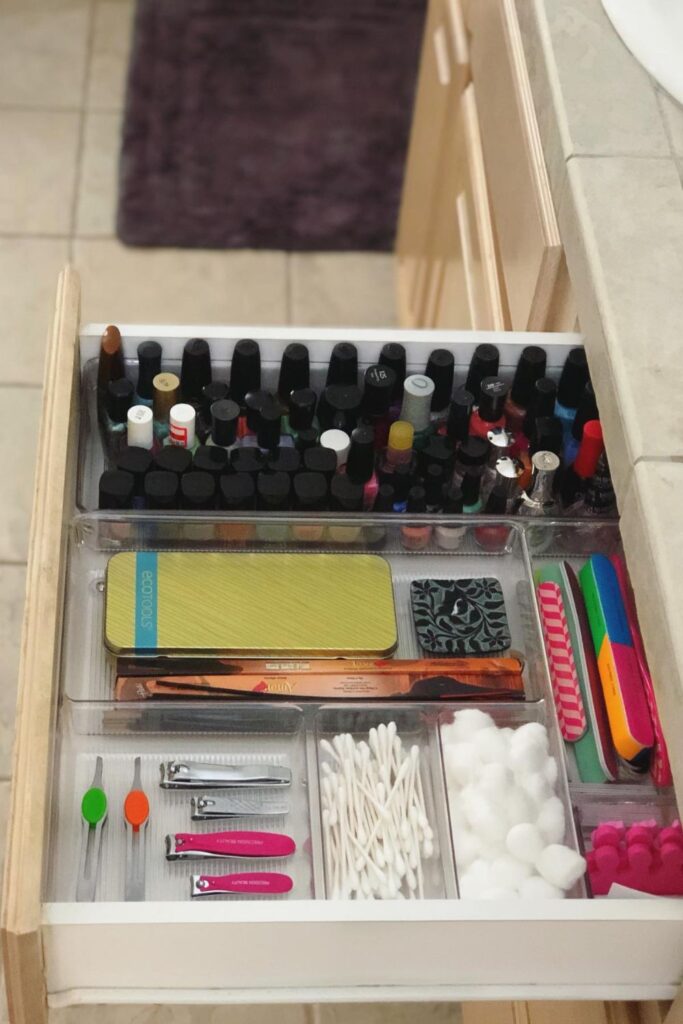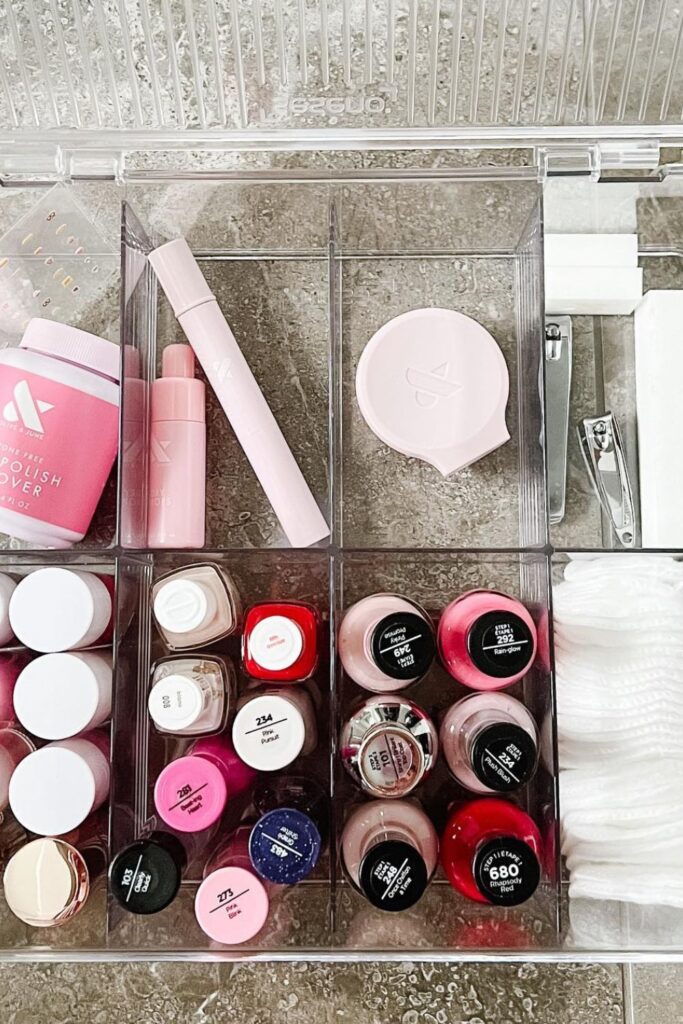 A single vanity drawer can hold an entire nail care setup once the space is divided properly. Clear organizers help separate polish bottles from tools.