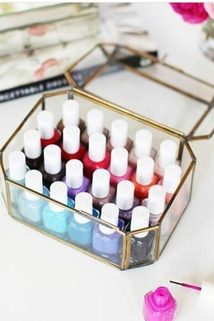 It’s easy to recreate the idea: just pick a clear jewelry or trinket box that is deep enough for polish bottles and line them up neatly so they don’t fall over.