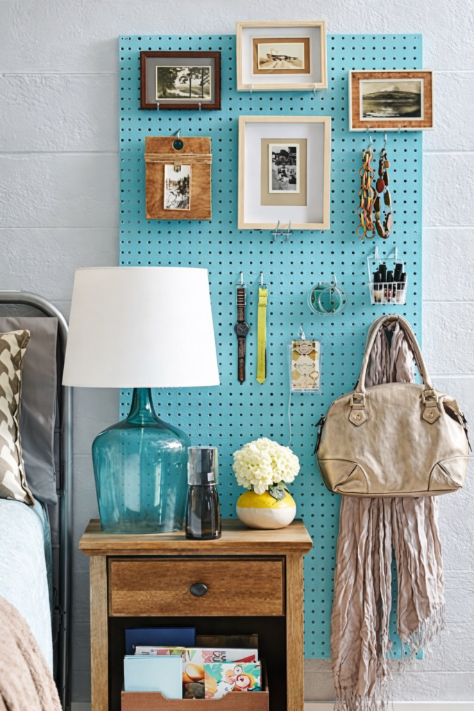 A pegboard setup fits perfectly in narrow bedrooms, hallway corners, or beside entry doors where furniture won’t fit.