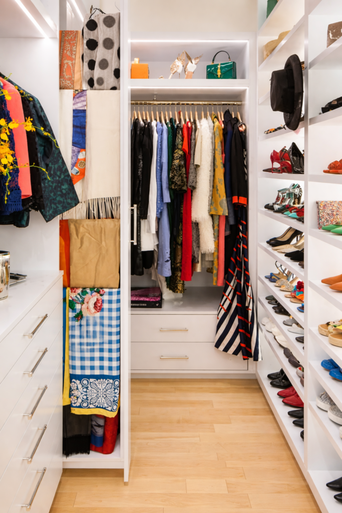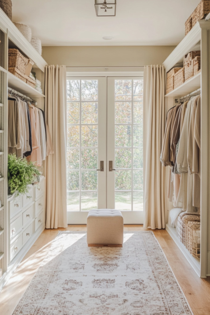 Keep shelving and hanging rods mirrored on both sides to maintain symmetry. Natural daylight does the heavy lifting here.