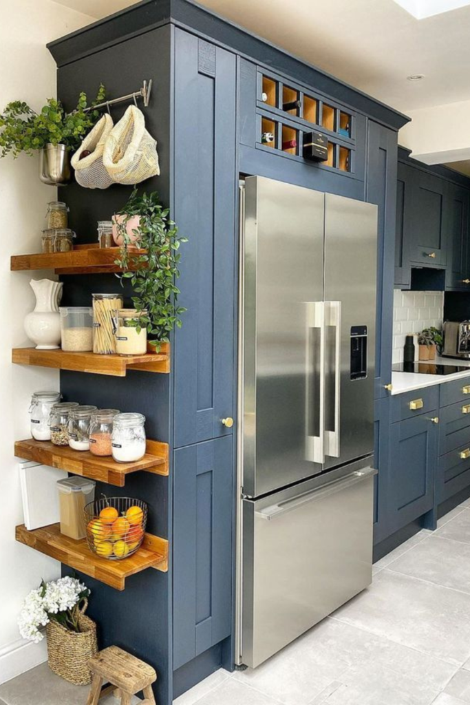 That awkward strip beside the fridge often stays empty for no good reason. Open shelving works best here.