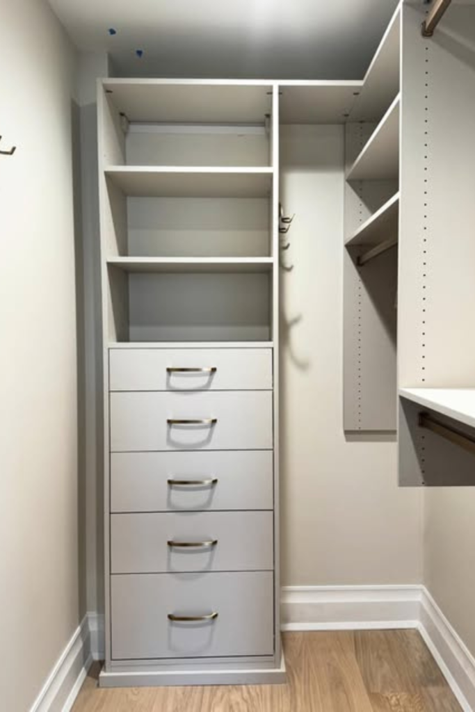 A narrow drawer tower works best in tight walk-in corners or beside hanging sections where depth is limited.