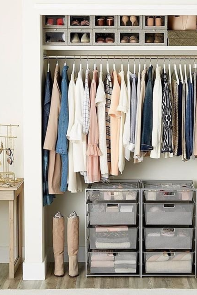 Width matters more than depth. Stack clear drawers below hanging clothes to keep everything visible and easy to sort.