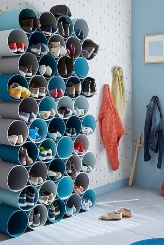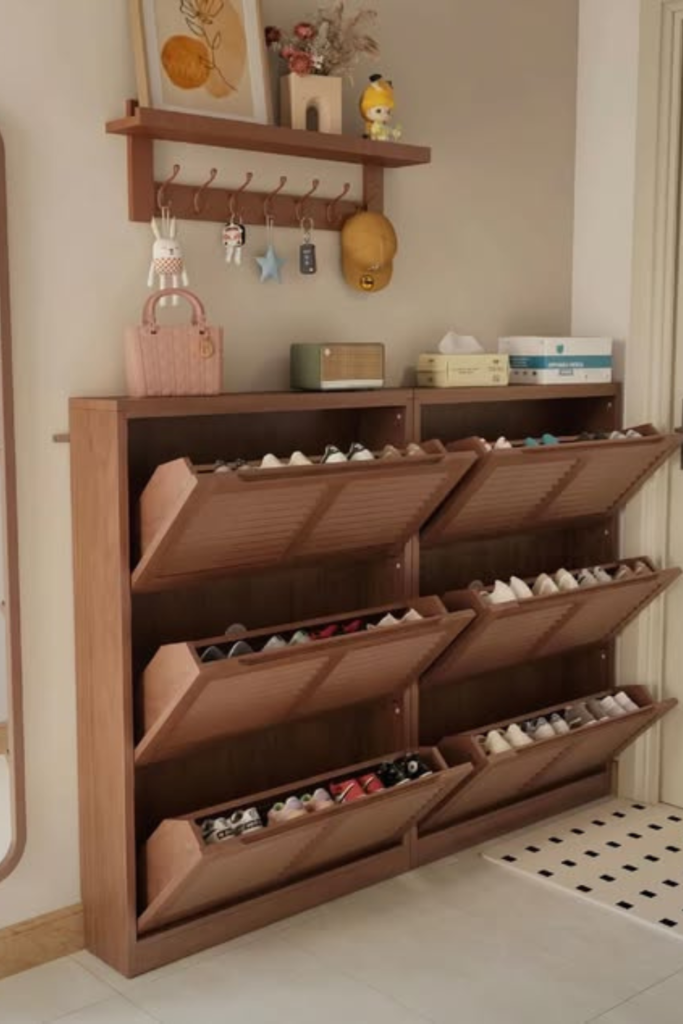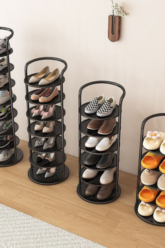 Floor space disappears fast when shoes spread sideways. Recreate this setup with stackable or rotating shoe racks.