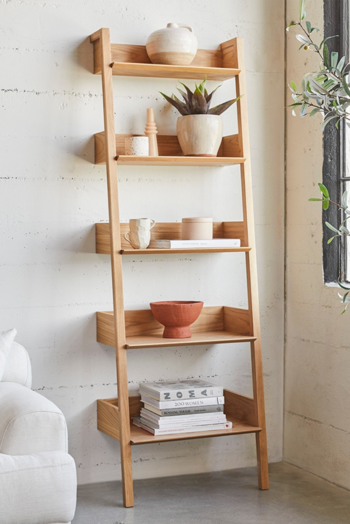 Corners and tight wall gaps feel empty when bulky furniture won’t fit. A leaning ladder shelf works best in narrow hallways.