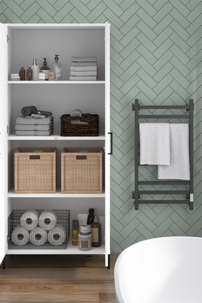 Bathrooms feel crowded when storage extends outward. Use adjustable shelves and baskets to separate daily items.