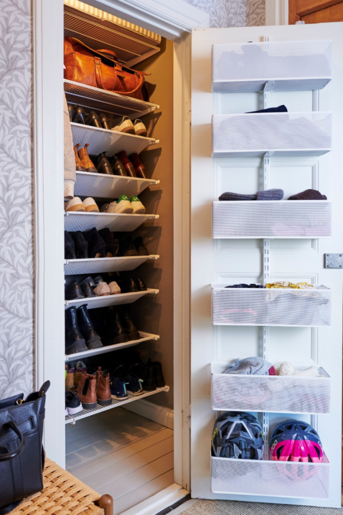 With limited interior depth. Add vertical rails with slim baskets to the door while keeping shoe shelves inside the closet.