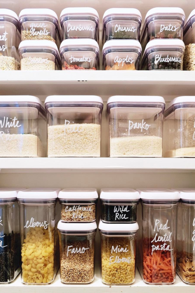 Small pantries fall apart when items stack deep and disappear. Shallow shelves lined with uniform containers.