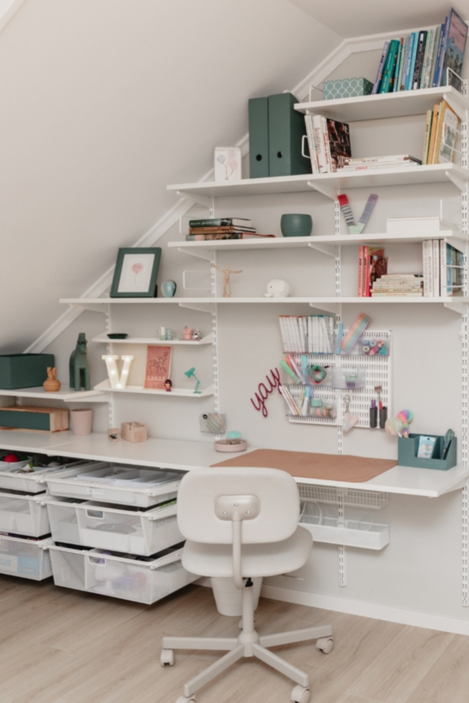 Handle both display and clutter. Adjustable shelving systems work best here because they follow the angle without wasting depth.