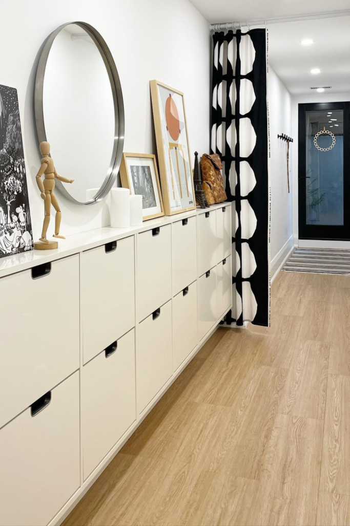 Shoes eat hallway space when they spread across the floor. A vertical shoe wall like this works best in narrow entry halls.