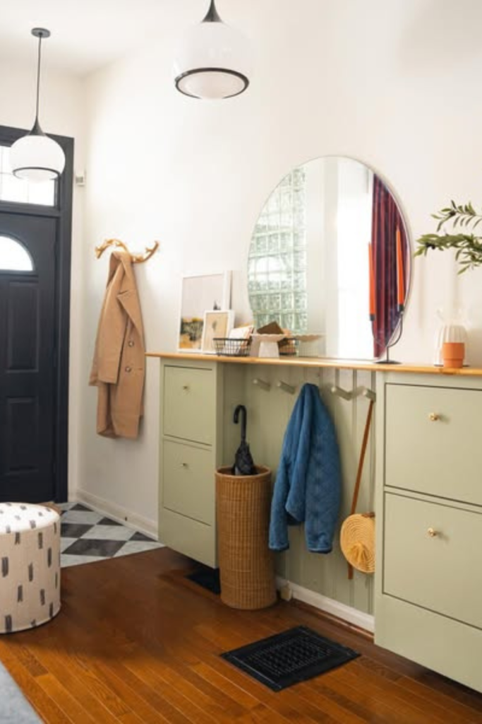 This works best right by the front door in narrow halls. Combining slim base cabinets with a wood counter for drop-zone storage.