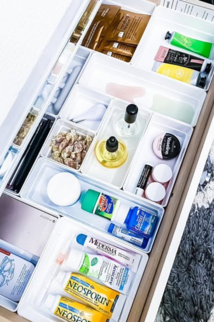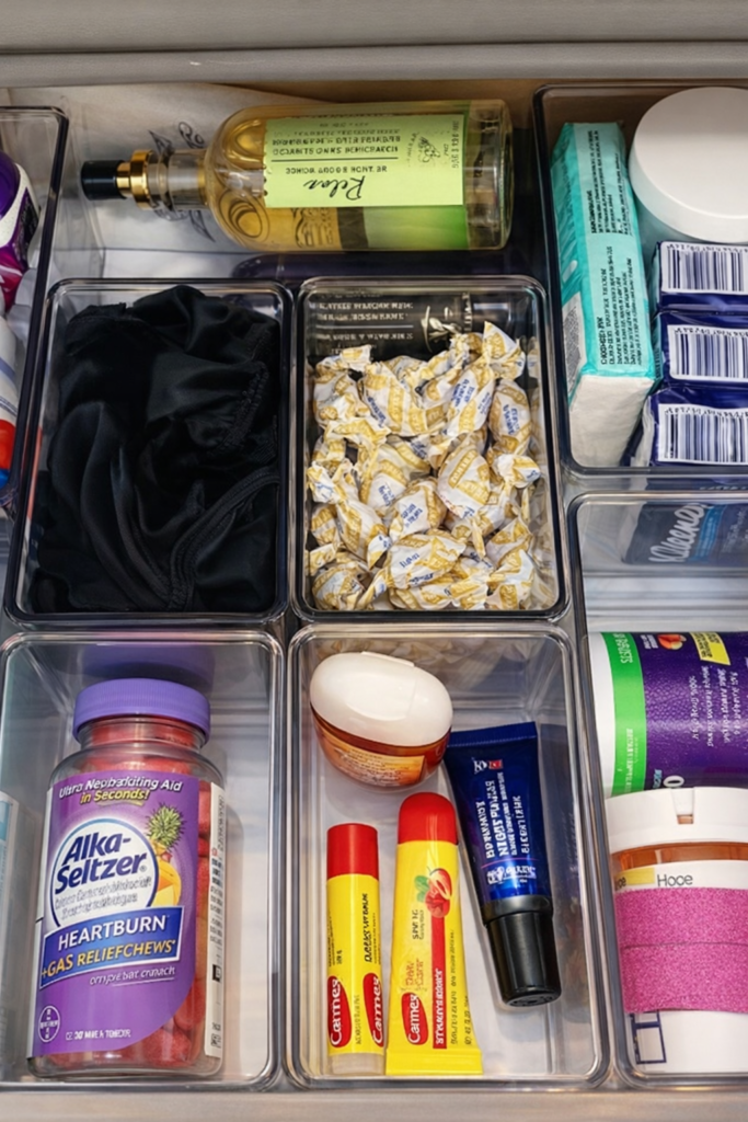 Order sticks by how you use them, not where they fit. Separate skincare, meds, first aid, backups into their own zones.