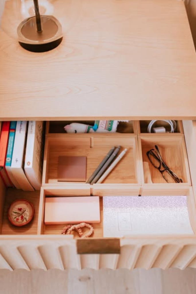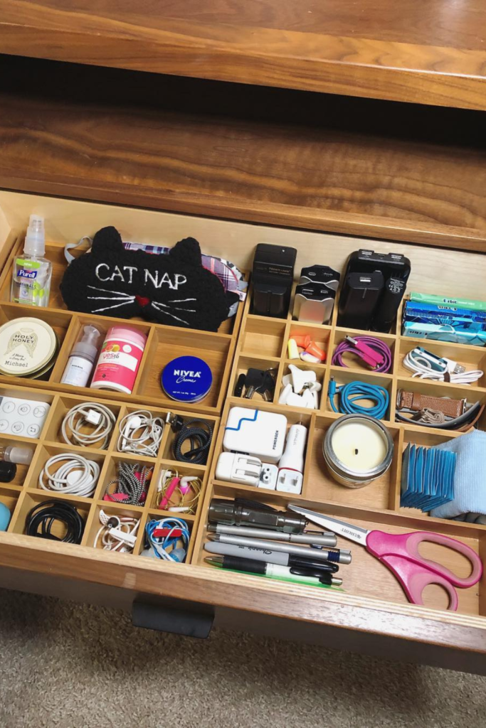 Chaos disappears when every object earns a specific square. Deep drawers benefit from grid-style dividers that separate tech.