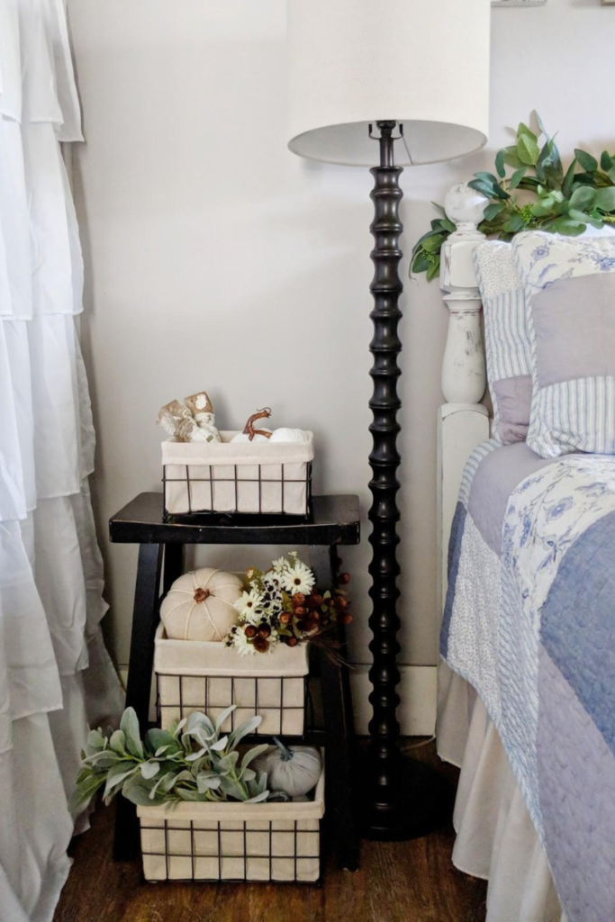 When drawers won’t fit, reserve the middle shelves for bedtime essentials and keep décor higher to avoid visual clutter.