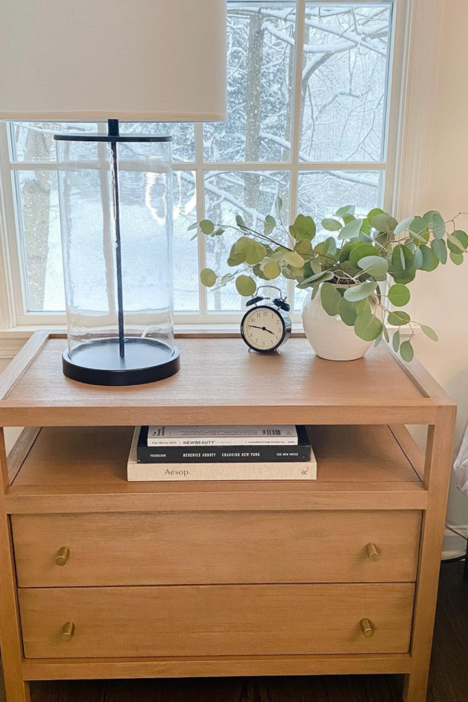 A clear or light-shade table lamp provides soft task lighting without visually weighing down the nightstand.