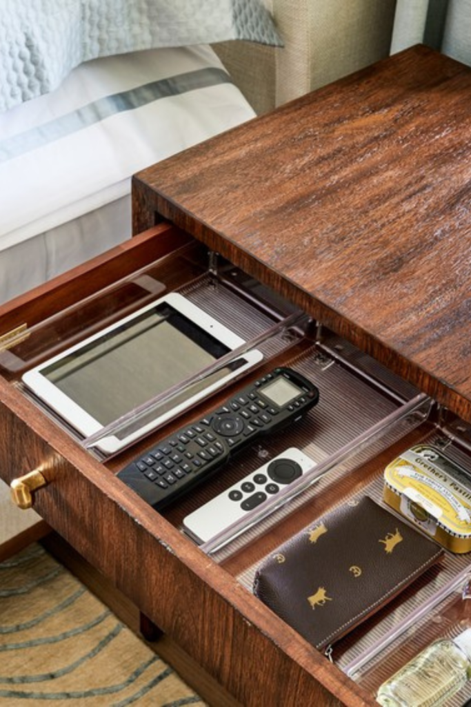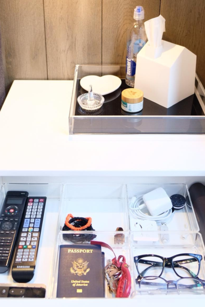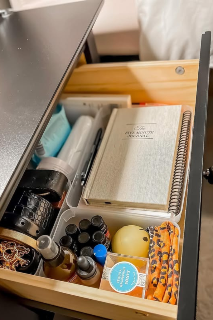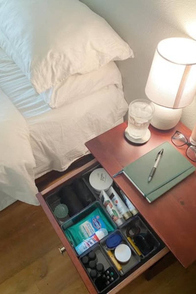 Bedside chaos fades when night-only items stay within arm’s reach. A divided drawer keeps skincare, meds.