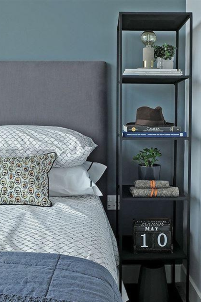 Floor space disappears fast in tight bedrooms, so going up solves the problem. A slim shelving unit works as a nightstand.