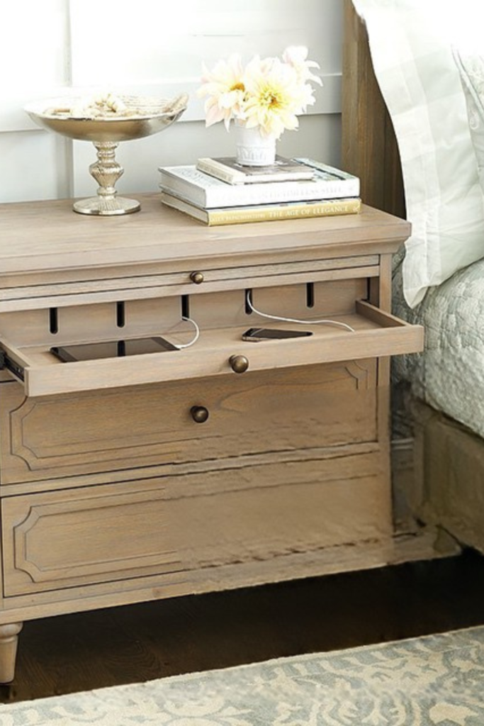 Nighttime clutter drops fast once charging moves out of sight. A shallow drawer with built-in cord access.