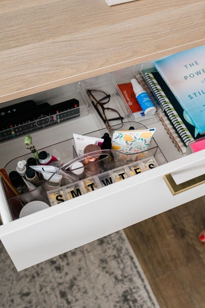 Bedtime decisions get easier when everything is visible at a glance. Transparent organizers keep skincare, notes separated.
