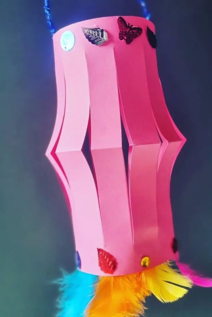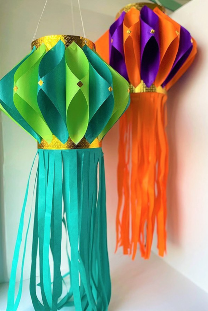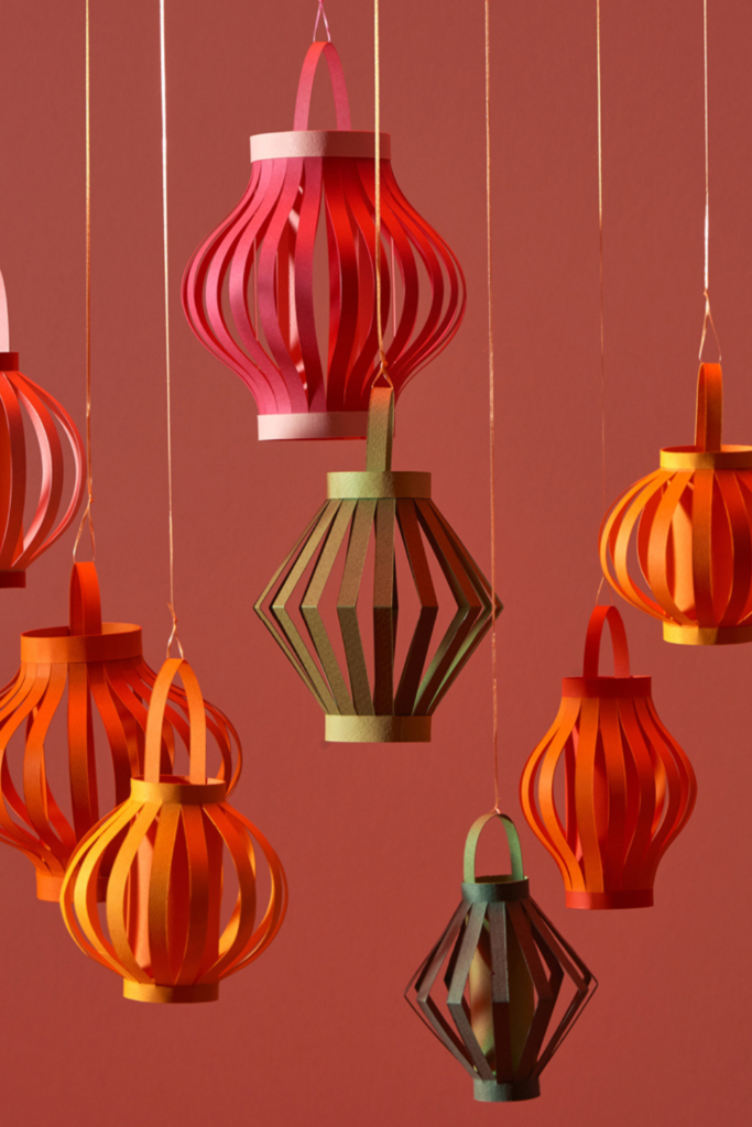 Soft shades keep everything playful. Use medium-weight construction paper so the lanterns hold their rounded shape.