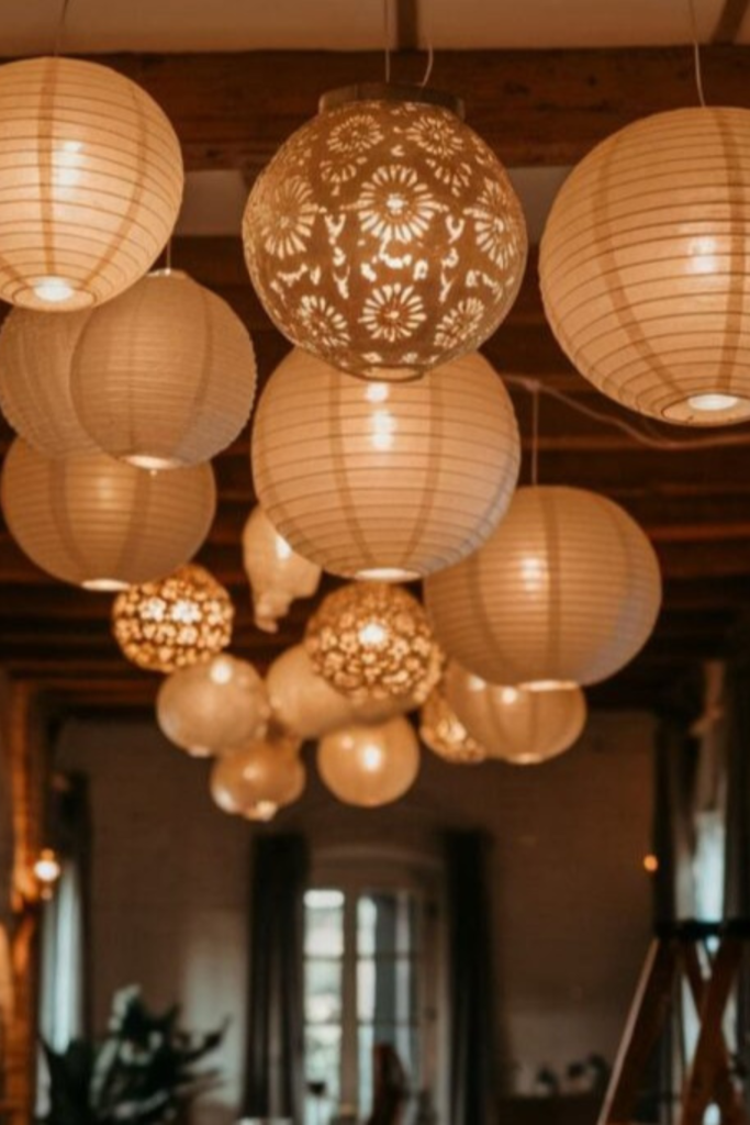 Mixing plain ribbed paper globes with a few detailed cutwork lanterns creates depth without overwhelming the space.