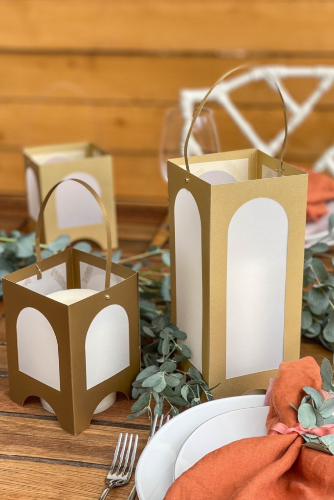 Cut panels from sturdy metallic cardstock to create a firm outer frame. Place a battery LED tea light inside each lantern for a safe.