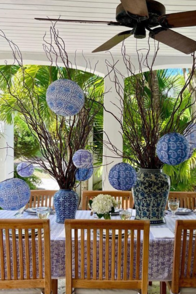 Hanging patterned paper globes from tall decorative branches creates height without installing ceiling hooks.
