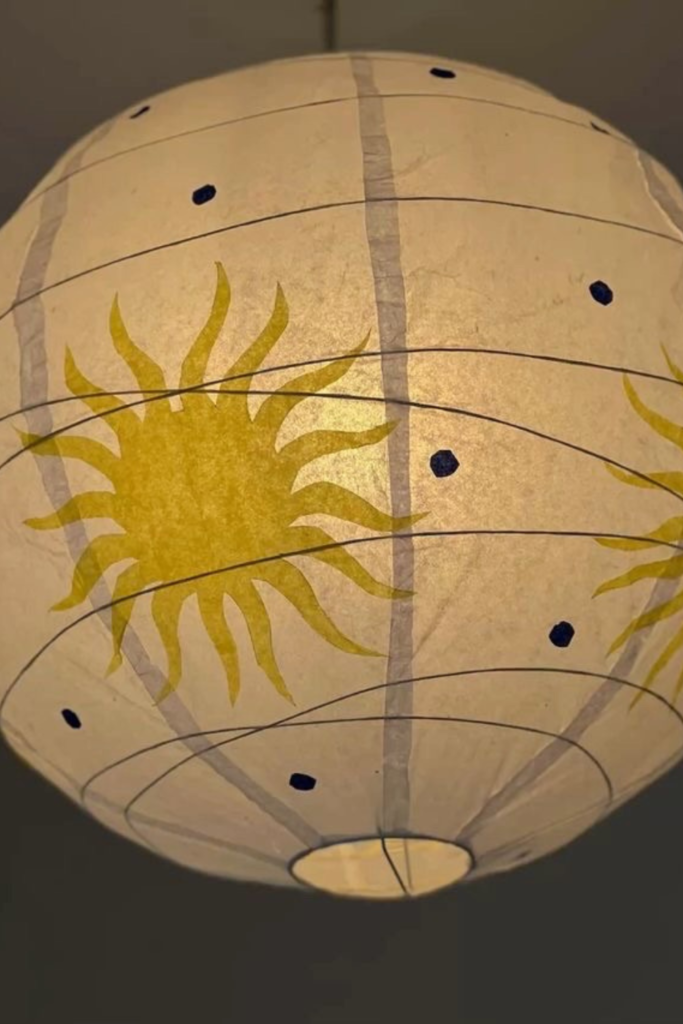 Round paper lantern with painted suns and scattered stars works beautifully in bedrooms, meditation corners.