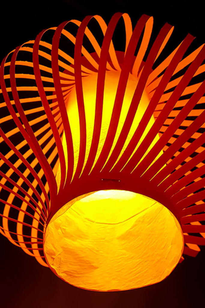 Curved ribs cast dramatic shadows, inner core emits a warm, steady glow. Install a warm-white LED bulb or a low-heat LED pendant kit inside.