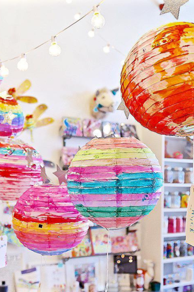 Painted globe lanterns like these work perfectly for classrooms, birthday parties, or creative playrooms.