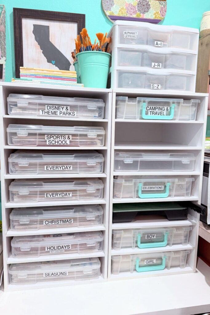Paper collections stay manageable when every category has its own labeled drawer. Shallow clear drawers like these work perfectly.