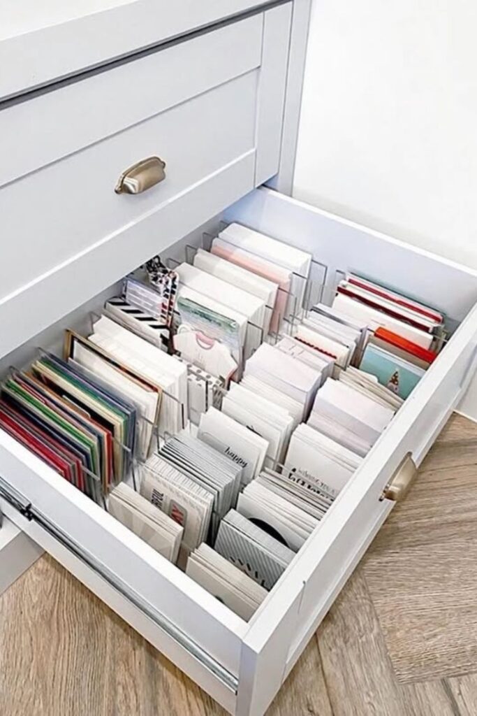 Deep drawers turn into paper chaos quickly unless the space is divided. Clear dividers like these transform a single drawer into multiple organized sections.