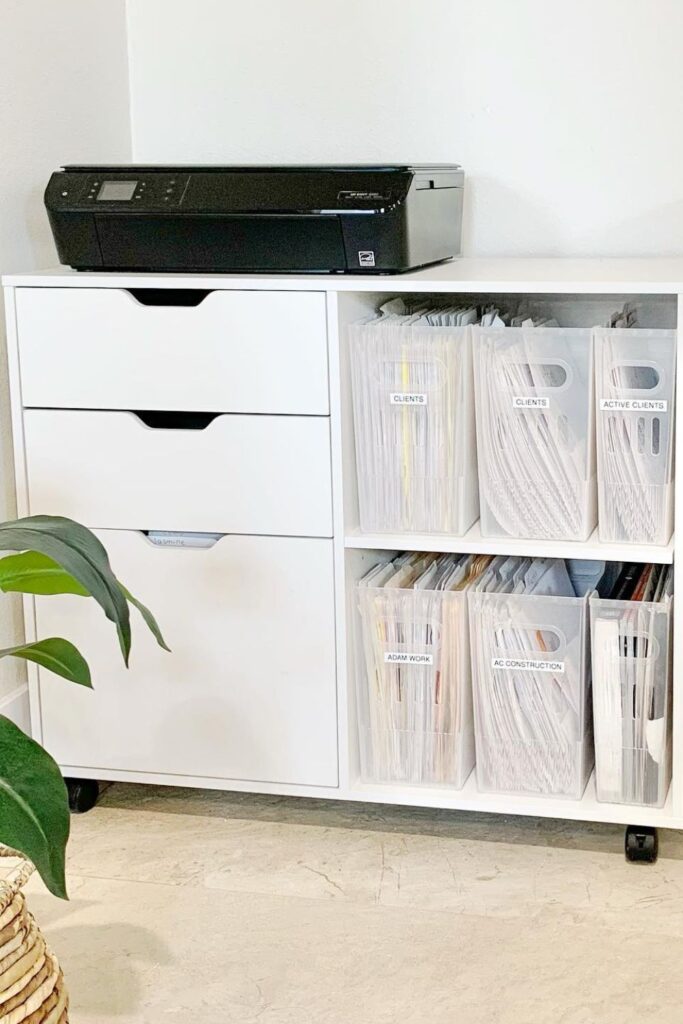 While still being easy to get to. Clear vertical bins keep files upright so you can see the documents instead of having them disappear into deep drawers.
