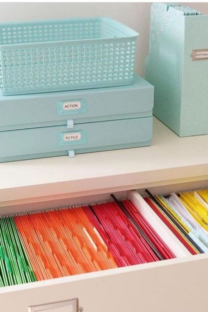 Sorting paperwork by color creates a system that is fast to understand at a glance. Clear plastic bins like these work well.