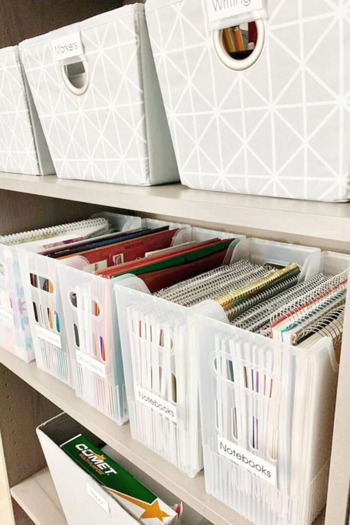 These open shelf bins make it easier to see and get to notebooks, folders, and papers by making obvious portions.