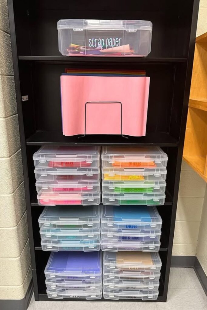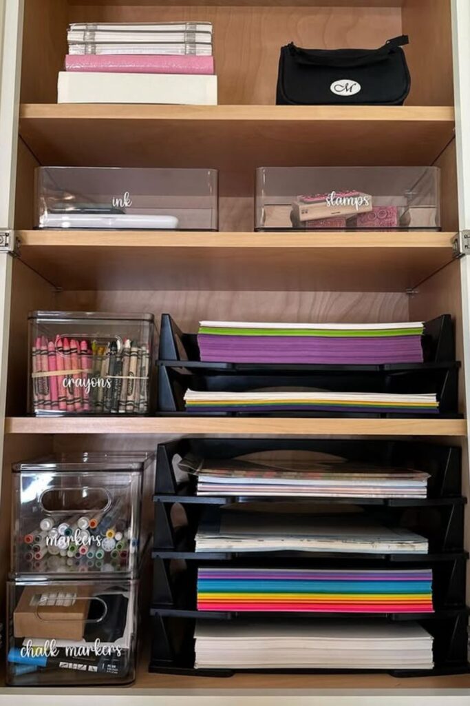 Small paper supplies often create clutter because they scatter across drawers and shelves. Clear bins instantly solve that problem by giving each item its own visible space.